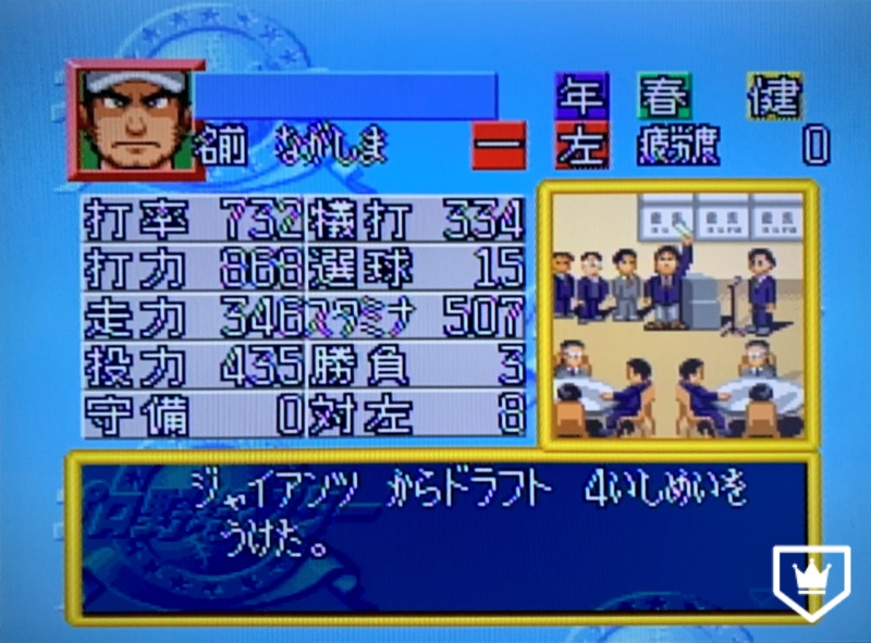 プレイヤー数値は、「打率732、打力868、走力346、守備0」ともはやDH専門の大型和製大砲への道を爆走。三打席連発アーチを放ちながら自チームは敗退という弱小野球部でも、自称ライバルのくれない君や友人のさとう君が適度に絡んでくる大学時代を過ごし、いざ4年秋のドラフト会議へ。なお、指名漏れした場合は社会人野球チームのNCCへ進むことになるが、これだけの打力があればドラ1でプロ入りできるだろう。