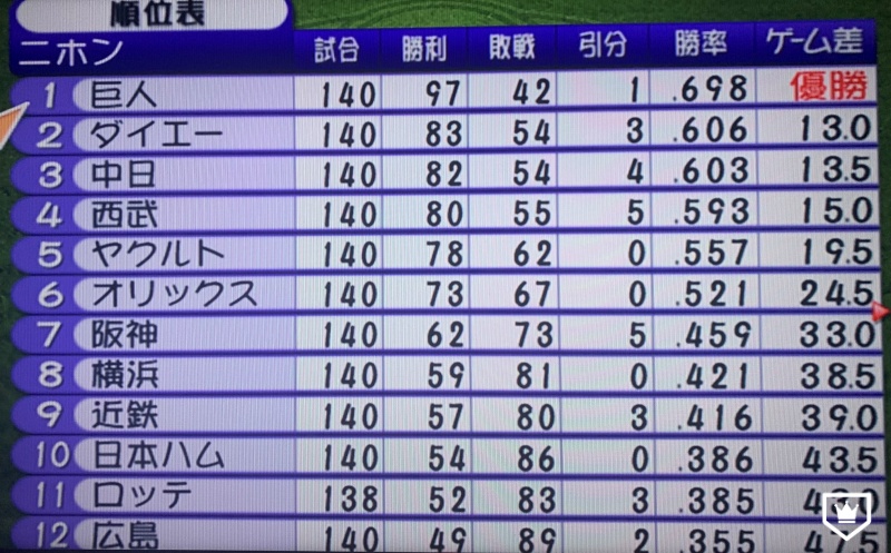 打者成績が上がりすぎるのを防ぐため、ストライクゾーンを上下左右に+1ずつ広め、ボール飛距離は−1の初期設定で実行したペナントでは、巨人が2位ダイエーに13ゲーム差をつけて独走優勝。