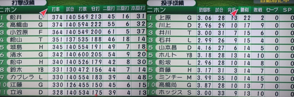 最初はボールの反発力+3にしてオート進行したら、小笠原道大(日本ハム)が打率.447、タフィ・ローズ(近鉄)が62本塁打という凄まじい成績になってしまったので、調整なしのノーマルボールやあえて飛距離マイナス数値の低反発球を試してみる。何度かシーズンを繰り返してみたが、優勝争いは2003年に日本シリーズを戦ったダイエーと阪神、そして強力打線の巨人の三つ巴のケースがほとんどで、そこに西武、ヤクルト、中日が上位で絡んでいくペナントが多かった。逆指名ドラフト時代の真っ只中、もし実際に強引に1リーグ制へ移行していたら、似たような展開になっていたのではないだろうか。