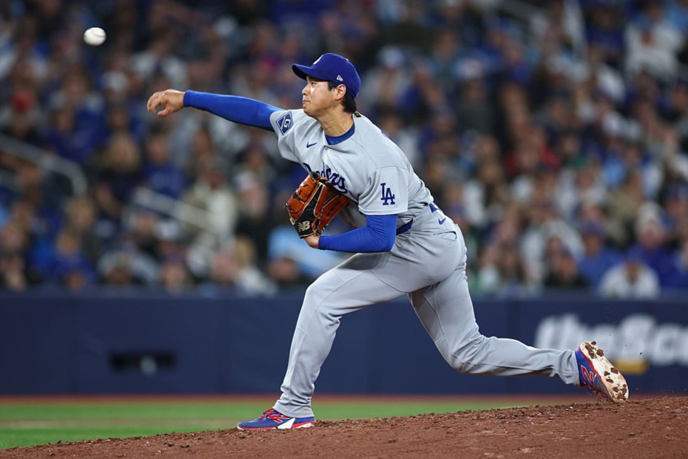 大谷は初回の第1打席、ブルージェイズ新加入の右腕シースから四球を選び、日本人最長タイ記録となる43試合連続出塁をマーク。直後のマウンドでは一死一、二塁とピンチを招いたものの、4番サンチェスを三邪飛とした後、日米通じて初対戦の岡本和真を外角低め100.1マイル(約161.1キロ)のフォーシームで空振り三振に斬った。