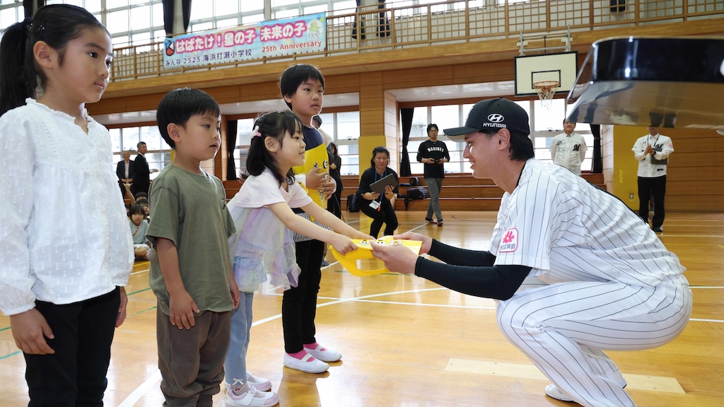 マリーンズのランドセルカバー配布は2012年から15年連続で実施している地域振興活動であり、ランドセルカバー贈呈式への選手参加は今回で13回目(※2020年、2021年は未実施、2022年は松川虎生捕手がオンラインで参加)。なお、昨年は木村優人投手が千葉市内の小学校を訪問した。今年は約2,000枚のランドセルカバーを、千葉市内35校に通う小学1年生全員へ、教育委員会を通じて無償配布した。
