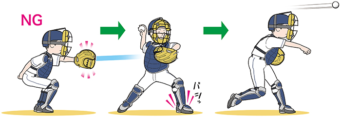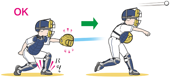 そのためには、イニング間の捕手の送球がキチンと二塁ベースに正確な送球がされてプレーが完結することが大切です。投球を受けてから素早く握り替えて投げることも大切ですが、あくまでイニング間ですから捕球してから一度止めて、しっかりとステップしてから送球するのもアリです。