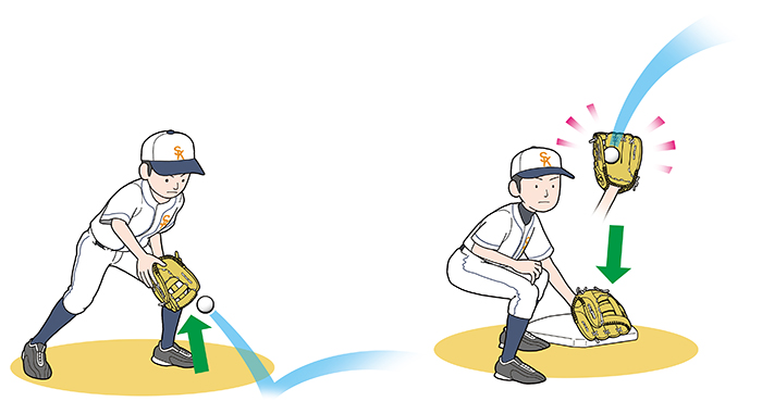 ・捕球してからのステップの歩数を減らす。できれば捕球時に左足を踏みこんで、すぐに右足をステップできる準備をしたい。