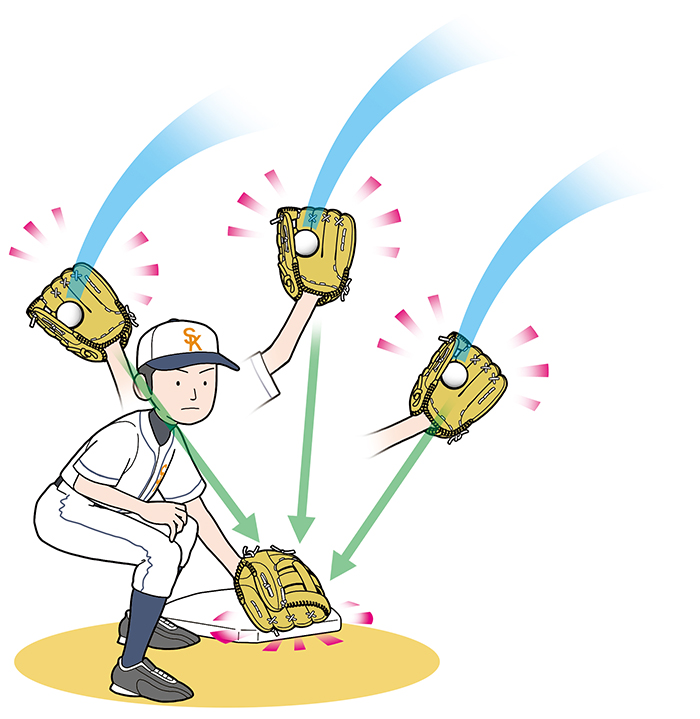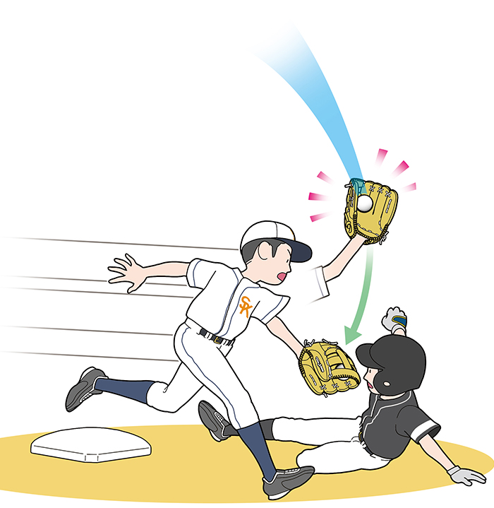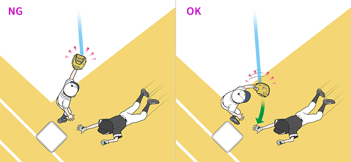 ・牽制球がタッグしやすいベース付近に送球された場合、捕球してからタッグに移るのではなく、できるだけバックハンド(右利きの場合)でタッグするベースの近くまでミットを引いて捕球したい。捕球自体がタッグになるイメージ。
