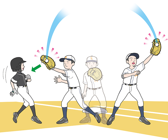 ・送球は山なりでもノーバウンドの方が二塁到達タイムは速い。ただし、ワンバウンド送球のほうがタイムは遅いが正確性に勝る。どちらが良いかは状況による。